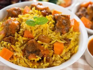 - نضع الملح واللوز والكشمش فوق الرز ثم نخلطهم.