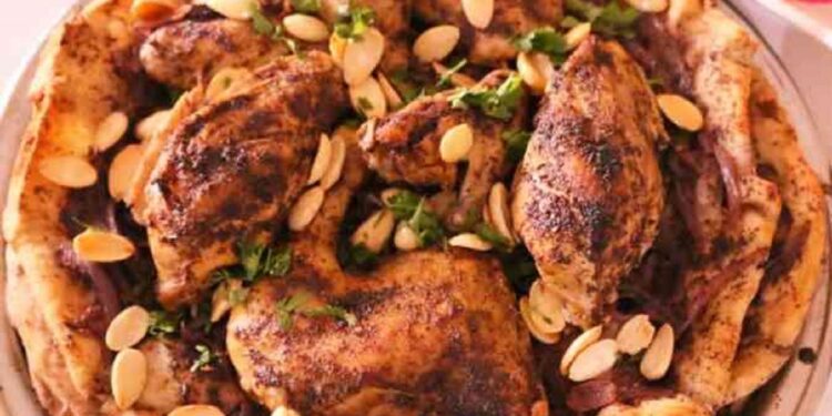 - نأخذ رغيف الطابون وندهنه بسائل البصل من الجهتين ويوضع في صينية ويضاف عليه البصل ثم اللحم المقلي ويرش كثيراً من السماق وتدخل الفرن لمدة 4-5 دقائق من فوق أي تحت الشواية ثم تنزل لتحمير الوجه الآخر لمدة 4-5 دقائق ثم توضع الدجاجة المحمرة ويرش الصنوبر أو اللوز وتقدم مع اللبن وبالهناء والشفاء.
