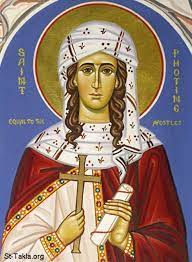 ولمّا سار إليه السامريّون وسمعوا كلامه، آمنوا به وقالوا للمرأة:” لسنا من أجل كلامك نؤمن الآن، بل لأننا نحن قد سمعنا ونعلم أن هذا هو في الحقيقة مخلّص العالم” (يوحنا 4: 42). فتكون المرأة السامرية فوتينا هي التي بشرت السامريين بالمسيح، كما يرويه لنا يوحنا الإنجيلي. ويروي التقليد أنّ هذه البارّة بعد أن تفرّق الرسل في الآفاق، ذهبت هي أيضاً إلى مدينة قرطجنة فبشرت فيها بالإنجيل.