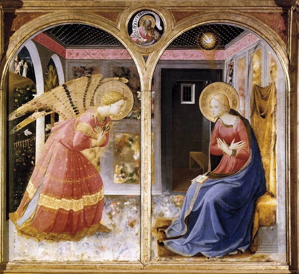 قال لوقا الانجيلي: في الشهر السادس ( من الحبل بيوحنا)، أرسل الملاك جبرائيل من قبل الله، إلى مدينة في الجليل تسمى الناصرة، إلى عذراء مخطوبةٍ لرجل اسمه يوسف من بيت داود، واسم العذراء مريم. فلمّا دخل الملاك إليها، قال لها: