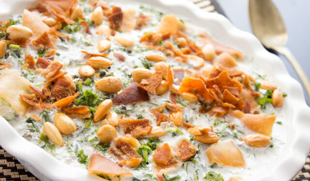 - يوضع خليط اللبن على السبانخ وتزين بالخبز المحمص وبالهناء والعافية. وتقدم حالاً.