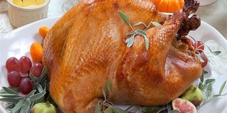 - يستخدم 3 ملاعق من الزبدة لدهن الجهة اليمنى من الديك الرومي بين الجلد واللحم و3 ملاعق لدهن الجهة اليسرى بين الجلد واللحم. دهن لحم الديك الرومي بالزبدة يحافظ على طراوة لحم الديك الرومي حتى بعد الشواء.