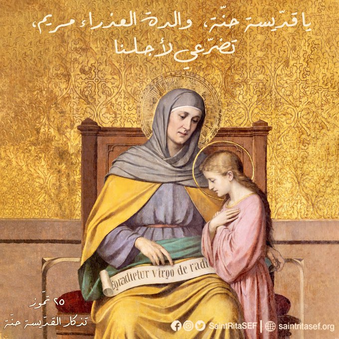 ولدت القديسة حنة في بيت لحم من سبط يهوذا. تزوجت حنة بيواكيم، فاتحدت بزواجها ذرية الكهنوت بذرية داود. ولم يكفّ الزوجان عن التضرع إلى الله ليرزقا ولداً، لأنهما كانا قد طعنا في السن ولم يكن لهما ولد. ولما تقدم يواكيم بتقدمة إلى الهيكل، رفضها الكاهن بداعي العقرية. فرجع يواكيم حزيناً، باكياً وتاه في البرية صائماً أربعين يوماً. وكانت حنة مواظبة على الصلاة. فظهر لهما ملاك الرب وبشرهما بأن الله قد قبل صلاتهما. وأنه يرزقهما بنتاً تكون أطهر النساء وأشرفهن.