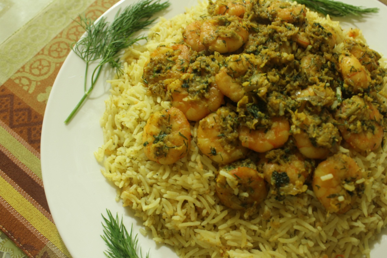 - نضع البقدونس مع البصل ثم نضيف الروبيان المقشر.