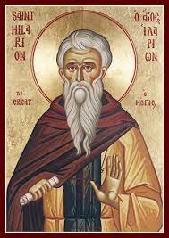 ولد ايلاريون في بلدة تدعى طاباتا، بالقرب من غزَّة، من والدين وثنيَّين غنيين. فأرسله أبوه إلى الإسكندرية لاقتباس العلوم، فنبغ في دروسه. وأخذ يجالس العلماء، وجلَّهم من مسيحيين. فدرس عليهم العقائد المسيحية، فراقت له بما فيها من سموٍ وترفعٍ عن حطام الدنيا. فآمن بالمسيح واعتمد. ثم زهد في خيور الأرض وعكف على الصلاة والتأمل.