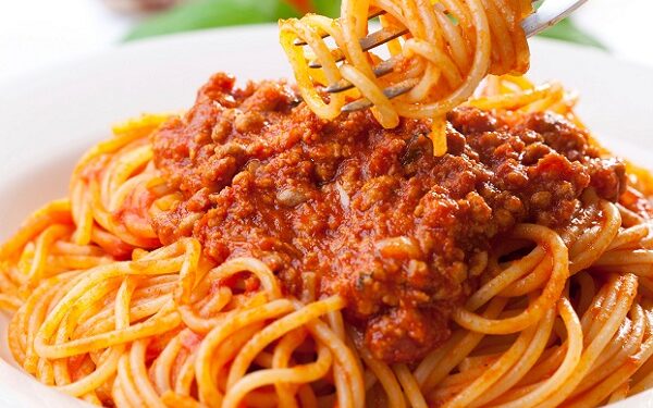 - نضع المكرونة في صحن التقديم وفوقها صلصة اللحم.