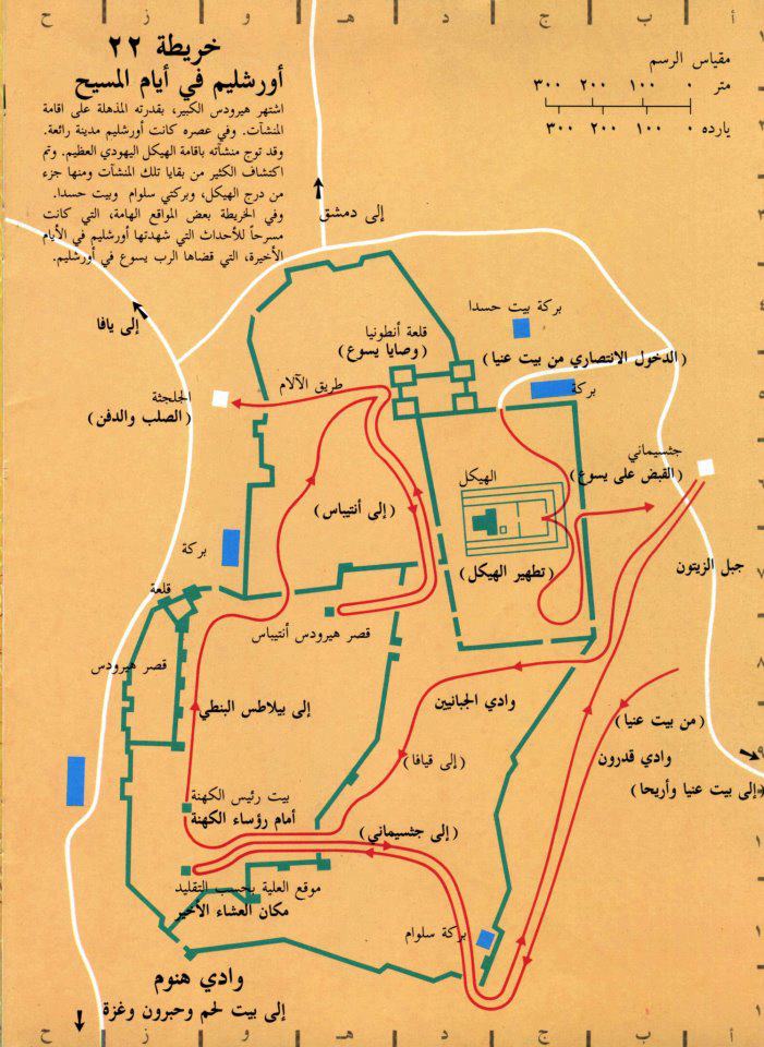 اشتهر هيرودس الكبير , بقدرته المذهلة على إقامة المنشآت . و في عصره كانت أورشليم مدينة رائعة . و قد توج منشآته بإقامة الهيكل اليهودي العظيم . و تم أكتشاف الكثيرمن بقايا تلك المنشآت و منها جزء من درج الهيكل , و بركتي سلوام و بيت حسدا . و في الخريطة بعض المواقع الهامة , التي كانت مسرحا للأحداث التي شهدتها أورشليم في اﻷيام اﻷخيرة التي قضاها الرب يسوع في أورشليم .