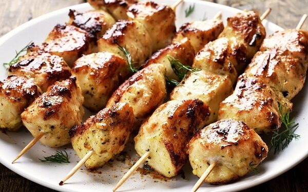- تشك قطع الدجاج بعيدان خشبية (يجب نقع أعواد الخشب بالماء قبل ½ ساعة من استخدامها حتى لا تحترق) أو بالأسياخ الحديدية مع قطع الفلفل الأخضر والفطر الحب وتشوى عل الفحم أو في صينية بداخل الفرن.