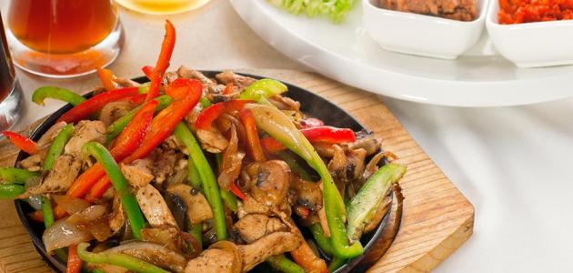 - تضاف شرحات من الفليفلة الخضراء والحمراء والصفراء للبصل وأقلبها معه حتى تذبل ثم يضاف لهم شرحات اللحم والبهارات المكسيكية ويقلبوا معا.