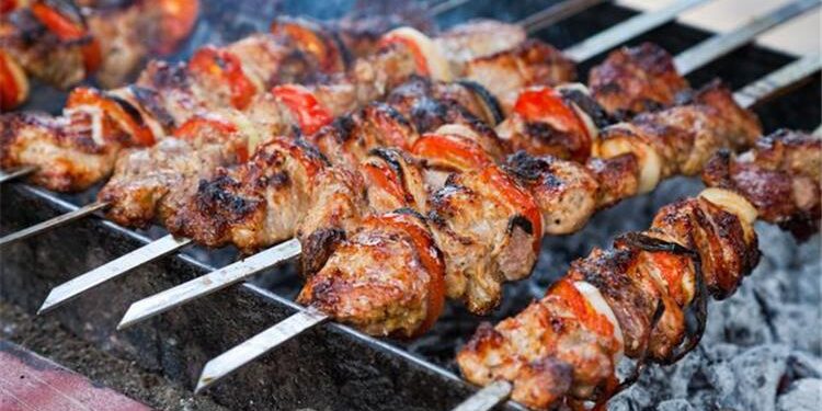 - تحضر منقلة الفحم للأشتعال بينما نبدأ بوضع اللحم في الأسياخ بتأني.
