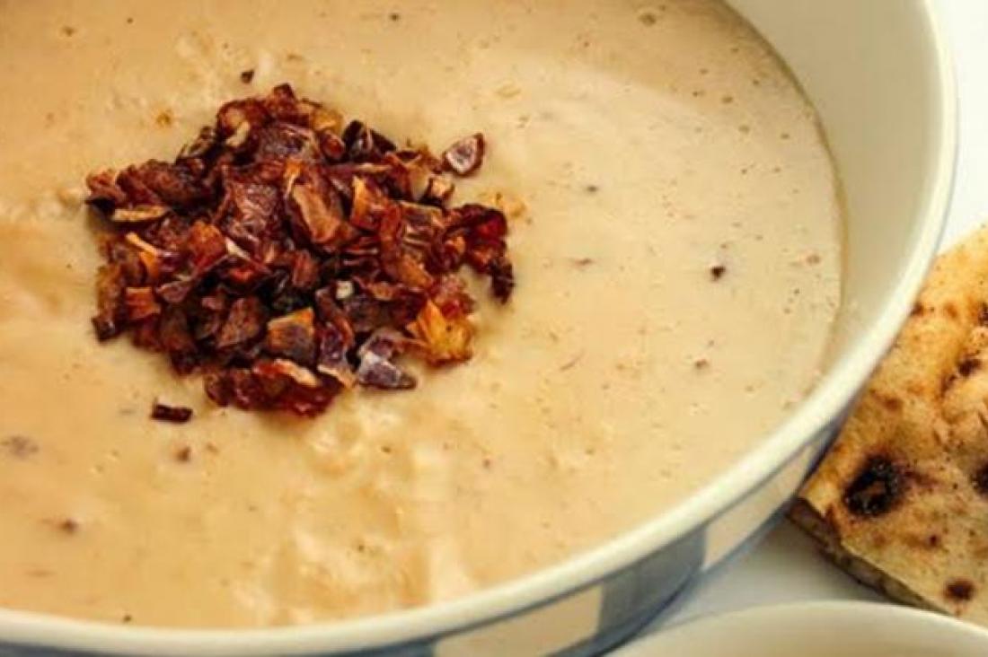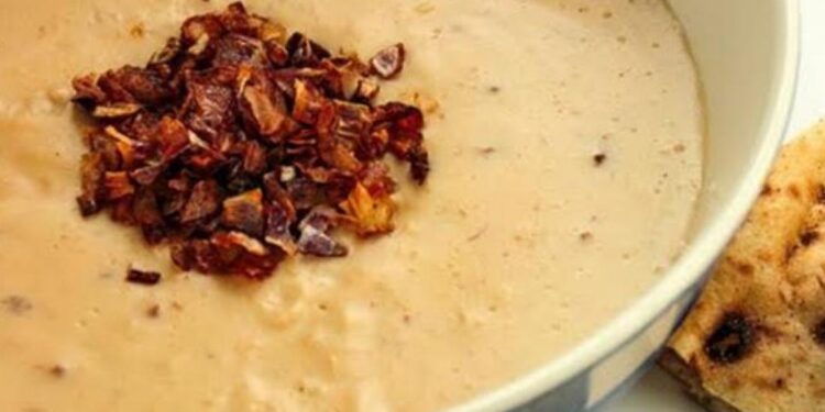 - تصب في طبق ويوضع عليها البصل المحمر وهنا البصل المحمر في السمن ليس للتجميل هو من أساسيات الطبق.