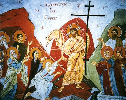 إن معطي الحياة يقود البشر من الجحيم في هذا اليوم، ويرفعهم إلى السماوات. إنه يطرح قوى العدو ويكسر أبواب الجحيم بقوة سلطانه الإلهي. على الأرض، الملائكة يذيعون الأنباء السارة للبشر ويعلنون قيامة المسيح. متزينين بثياب بيضاء منيرة، الملائكة يسألون حاملات الطيب: لماذا تطلبن الحي بين الموتى؟ لقد قام. إنه ليس ههنا! تعالين وانظرن المكان حيث كان رقد. تجري حاملات الطيب إلى الرسل حاملات لهم الأخبار السعيدة. ومن خلال الرسل والإنجيل يُبَشَّر بقيامة المسيح في كل العالم اليوم.