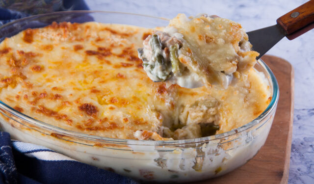 - توضع خلطة الدجاج مع الخضار في الصينية وتصب عليها صلصة البشميل.