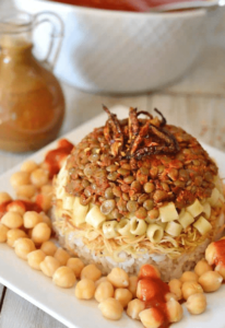 4. نضع الأرز فوق الخلطة ويترك على الحديدة الفاصلة عن النار لمدة ربع ساعة ويقدم مع اللبن (الزبادي) وبالهناء والعافية.
