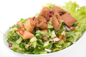 - يوضع الخس في أطباق التقديم وتغرف السلطة داخل أوراق التقديم.