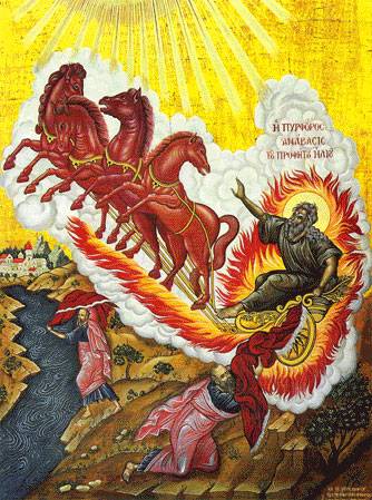 وفي أيقونة أخرى، نرى النبي إيليّا جالسًا في مركبةٍ من نار، تجرّها أحصنةٍ نحو السماء، تلفّها غيومًا بيضاء