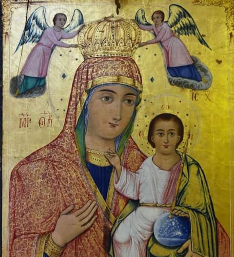 تطل علينا العذراء مريم الملكة من كنيسة العذراء مريم وابي سيفين بكفر سلامة وهي حاملة السيد المسيح عن يمينها في أيقونة من الفن الاورشاليمي يُظهر فيها صانع الأيقونة جمال سيدتنا العذراء مريم بالعيون اللوزيه والفم الصغير مشيراً إلى فضيلتي الصمت والاستنارة و هي متوشحة بالملابس الحمراء الملوكية المزخرفة ذات الحواف الذهبية والقميص الأزرق دليل على ملكها و نقائها