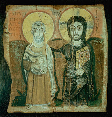 وفي الأيقونة التي تعد من أهم مقتنيات متحف اللوفر فى باريس – نرى السيد المسيح وهو يضع يده اليمنى على ” ابا مينا ” وهو فى الغالب رئيس الدير – ولليد اليمنى مغزى هام لأن ” يَمينُ الرَّبِّ صَنَعَتْ قُوَّةً، يَمينُ الرَّبِّ رَفَعَتْنى، يَمينُ الرَّبِّ صَنَعَتْ قُوَّةً فَلَنْ أَموت بَعْدَ، بَلْ أحْيا وأُحَدِّثُ بأعْمالِ الرَّبِّ، تأْديبًا أدَّبَنى الرَّبُّ. وإلَى الموْتِ لَمْ يُسلِمنى.” وهو ما نردده في المزمور المئة والسابع عشر والذي يستخدم فى صلاة الغروب بحسب طقس الكنيسة القبطية الارثوذوكسية . ومن المرجح أن ابا مينا هذا كان قد تنيح عند رسامة هذه الأيقونة – كما تشير وضع اليد اليمنى على الكتف إلى المعية مع المسيح ( أي أنه مع المسيح )