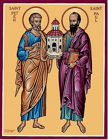 بطرس: على يسار المشاهد يقف القدّيس بطرس، شعر متموّج كثيف ولحية كثيفة ومستديرة (يكون عادةً لون الشعر واللحية أبيض)، يحمل بيمينه رسالة، هي رسالته الأولى، ويسند بيساره الكنيسة.