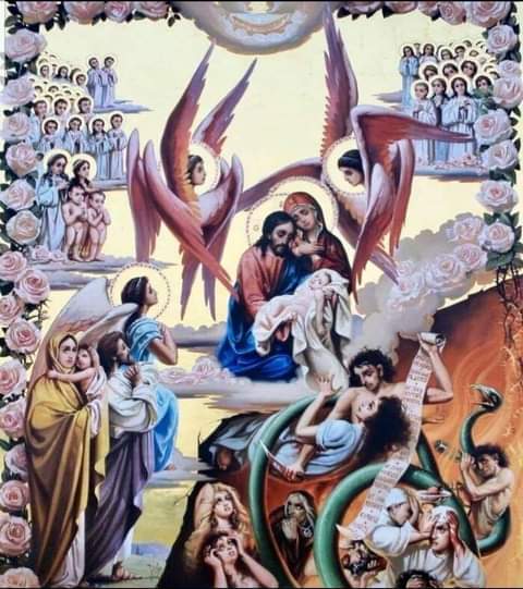 تبدو الأبالسة متهللة، بينما مريم والدة الإله حزينة على جرائم القتل التي تُرتكب، يُحيط بالمسيح الإله وأمّه مريم السيرافيم الذين يرنّمون وينشدون للأنفس الطاهرة التي تصعد إلى السماء.