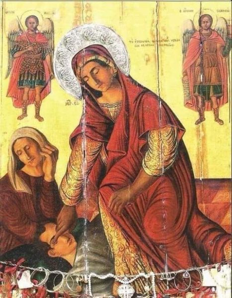 ثم مرت سنوات عديدة ونسي الناس أمر تلك الأيقونة. ولكن في العام 545 وعندما بدأ الإمبراطور الفارسي كسرى الأول يحاصر الرها، وكان وضعُ المدينة ميئوسًا منه، ظهرت والدة الإله الكلية القداسة للأسقف أولابيوس وأمرته بإنزال المنديل من الكوَّة المختومة فوق بوابة المدينة حتى يحميها من العدو. فبعد أن فتح الأسقف الكوّة وجد أيقونة المخلص غير المصنوعة بيد: وعلى اللوح الذي كان يُغلق الكوة انطبعت نسخة من الأيقونة. على أثر ذلك أقام الأسقف والشعب المؤمن زياحاً بالمنديل الشريف على أسوار المدينة فانسحب الجيش الفارسي.