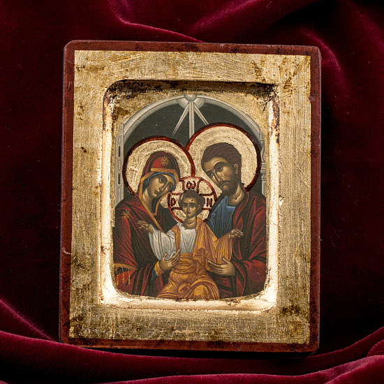 أيقونة العائلة المقدسة لحماية البيت من الخلافات والطلاق. والصلاة أمام هذه الأيقونة لإيجاد رجل أو امرأة، اطلبوا العون في حالة الحاجة أو الظروف الصعبة. نسخة من لوحة العائلة المقدسة من الكنيسة البيزنطية القديمة. خشب، خبز ذهبي.