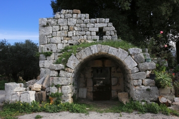ومن بين الحِجارة التي لم تَدخُل في البناء، واحدٌ يبدو كأنه مَذبَح وثنيّ، وحَجَر آخر عليه كتابة يونانية بقي منها، بعد أن أُصيب هذا الحَجَر بالقَضم نَتيجةَ التقصيب، سطر كامل تعلوه أحرف ثلاثة.
