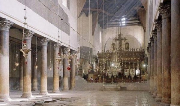 تمتد كنيسة المهد من الغرب إلى الشرق لها مدخل صغير تصل مساحتها إلى 12 ألف متر مربع ويمكن أن تميز فيها: