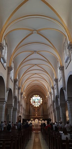 تخطيط الكنيسة بازيلكي مكوّن من أربعة صفوف من الأعمدة تكوّن خمسة أروقة، أعلاها وأوسعها الرواق الأوسط. ويضم كل صف أحد عشر عموداً، لكل منها تاج مذهّب ذو طراز كورنثي. وتوجد في أرضية الرواق الأوسط فتحتان تحتويان على بقايا من أرضيات الفسيفساء التي تعود إلى عهد قسطنطين.
