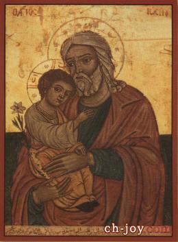 الأيقونة تظهر القديس يوسف حاملا الطفل يسوع على يده مع غصن زنبقة مورق ومزهر.