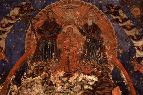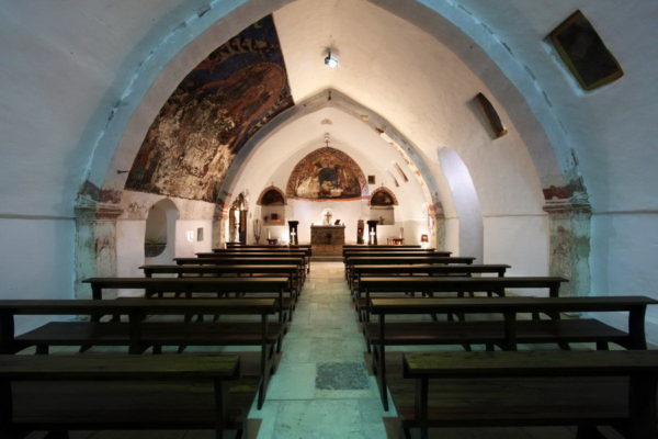 أمّا في الداخل فتعلو مذبحها صورة “المسيح الضابط الكلّ” وهو يتأبَّط الكتاب المختوم بسبعة أختام كمافي رؤيا يوحنّا، أي الكتاب المقَّدس بعَهْدَيه، وعن يمينه وشماله العذراء، واسطفانوس أول الشهداء، وفي الحنيَّتَين الصغيرتَين صورة للقديس يوسف حاملاً الطفل الإلهيَّ بيُسراه بينما يَدلُّ بيُمناه على مهنته كنجّار. وهناك أيضاً صورة للنبي دانيال مُلقى في جبّ الأسود. وعلى الحائط الشمالي توجد صورة للسيّدة العذراء يُتوّجها الثالوث الأقدس، وهي جِدرانية تُسمّى “نياح العذراء”، وتُشكّل تحفة الكنيسة إذ تَتَجلّى فيها السيّدة العذراء بثوبها الأرضيّ ووشاحها السماويّ واصلةً بهما ما بين دائرتَي الارض والسماء. وهي، بانحناءة رأسها وسمرة وجهها الشرقيّ الرائع، من أجمل الرؤى السماوية. إنها تنتقل من مرقدها الذي تحوَّل الى مذبحٍ تنيره أرزتان كأنهما شمعدانان، ويُكرّمها سُجوداً تسعة بطاركة في ليتورجية أرضية تقابلها في السماء ليتورجية الملائكة. ويعلو الجدرانية القمر والشمس.. رمزاً لنهارٍ أبديّ. ويتمُّ التتويج على وقع الأناشيد يُردّدها الروح القدس بالكرشونية- السريانية: ” تعالي معي من لبنان أيتها العروس فتتكلَّلين”.