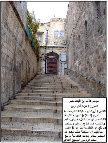 شاهد في الجهة الشرقية لموضع إنزال الجسد المقدس عن الصليب, درج شديد الانحدار, الذي يصل إلى منطقة الصليب االمحيي موضع صلب وموت السيد المسيح الذي غفر بدمه الكريم خطايا البشرية بعمل الفداء, وهو وضع الجلجلة أو الجلجثة بالعبرية أو موضع الجمجمة حسب ما ذُكر في إنجيل يوحنا البشير, توجد أيضا ثلاثة من الدرج التي تصل إلى هنا, أحدها موجود أمام مدخل الجهة الجنوبية من صحن كنيسة نصف الدنيا أي الكنيسة الرئيسية “الكاثوليكون”, الثاني من الباب المقدس للكنيسة الرئيسية “الكاثوليكون” والثالث من القسم الجنوبي الشرقي للكنيسة.