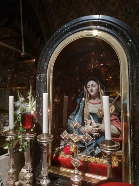 تقع الكنيسة الفرعية التابعة للاتين, وفقا للتقليد المتوارث, في المكان الذي وضعوا فيه مسامير السيد المسيح على الصليب, هنالك عمل من الفسيفساء, يمثل هذا المشهد, ويقع في الكنيسة خلف الهيكل الرئيسي. توجد على اليسار أيقونة لوالدة الإله بينما تتلقى ضربة حربة, ترمز إلى آلام السيد المسيح, وتعتمد على وصف وارد في الإنجيل (لوقا 2:35) “وأنت أيضا يجوز في نفسك سيف، لتعلن أفكار من قلوب كثيرة”.