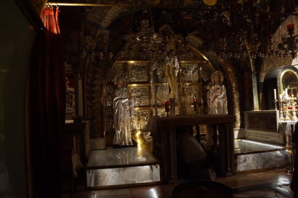 في القسم الشرقي من الكنيسة الفرعية التابعة للروم الأرثوذكس, أسفل المائدة المقدسة, التي ترتكز على أعمدة صغيرة ولا توجد عليها أية أغطية, حتى تترك مساحة حرة أمام سجود المؤمنين, نجد نقشاً مستديراً على الصخرة,وهو المكان حيث كان موضع صليب الرب يسوع المسيح, ويوجد فوق هذه النقطة طبق مزخرف مصنوع من الفضة, مقسم سطحه إلى خمسة أقسام تمثل أحداث في آلام السيد المسيح, بينما يحيط به حُلية زخرفية على الطراز اليوناني القديم يطلق عليها طراز “مينانذروس”.