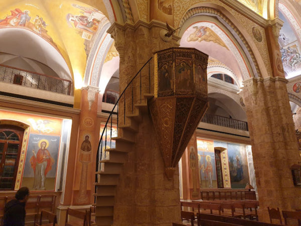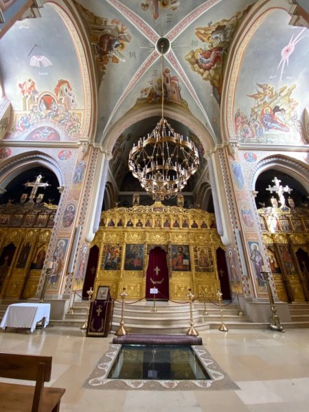 وتتابع تبقى من الكنيسة القديمة “الأيقونسطاس” الذى تم العثور على أجزاء منه فجرى ترميمها وأعيدت صناعة الأقسام المسروقة منه وضم القديم الى الجديد، والأرضية التى أصلحت وزينت بالموزاييك، وإحدى قطع الموزاييك نسخة عما وجد تحت الكاتدرائية، وكذلك التى جرى ترميمها بمعرفة فريق روسى رمم ما كان صالحا ً منها ونزع عن الحائط ما كان مشوها وألصقه على قماش ووضع فى صالون الكنيسة، ويعمل حاليا ً فريق من الرسامين اليونانيين على رسم ما تبقى من جداريات.