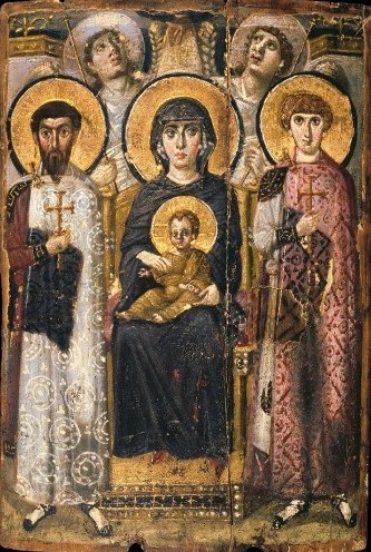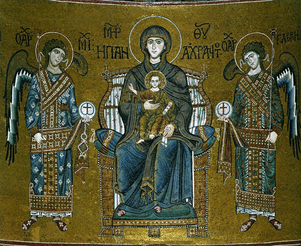 هذا الشكل الملوكيّ لوالدة الإله يترجم مكانتها منذ القدم في المحيط الرومي- القسطنطينيّ، فعاد واعتمد بقوّة مثلًا في فسيفساء تعود للقرن العاشر تظهر والدة الإله مع الرب يسوع المسيح بين الإمبراطورين المسيحين يوستنيانس (٤٨٣-٥٦٥م) وقسطنطين (٢٧٢-٣٣٧م) في كاتدرائيّة آيا صوفيا، وفي فسيفاء لوالدة الإله مع الرب يسوع بين الملاكين ميخائيل وجبرائيل الموجودة في كاتدرائية مونريال سيسيليا–القرن الثاني عشر، وكذلك في أماكن أخرى.