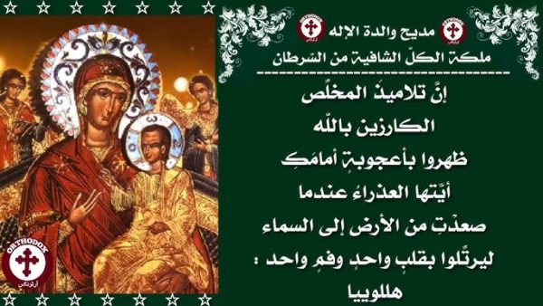 يا والدة الإله العذراء مريم التي لم يباشرها رجل. يا من حملت يسوع المسيح حملا لا يفسر. داومي الابتهال إليه. طالبة أن يخلص من الخطوب عبيدك ومسبحيك.