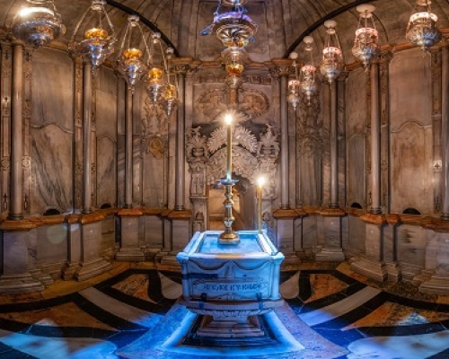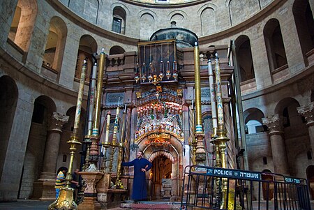 في الغرب من ” كنيسة نصف الدنيا ” في كنيسة القيامة , أسفل قبة الكنيسة , نوجد المقصورة المقدسة , فوق قبر المسيح . انه القبر المقدس , المحج الرئيسي بكنيسة القيامة , وامنية كل مسيحي الذي يريد ان يتواجد في هذا المكان حيث انتصر نور المسيح على ظلام السقوط , الهلاك والموت .