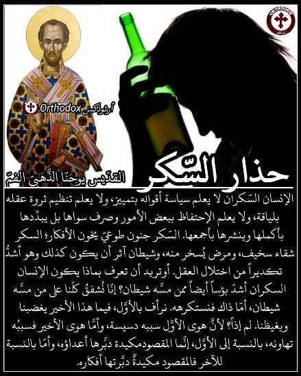 الإنسان السّكران لا يعلم سياسة أقواله بتمييز، ولا يعلم تنظيم ثروة عقله بلياقة، ولا يعلم الإحتفاظ ببعض الأمور وصرف سواها بل يبدِّدها بأكملها وينشرها بأجمعها. السّكر جنون طوعيّ يخون الأفكار؛ السكر شقاء سخيف، ومرض يُسخر منه، وشيطان آثر أن يكون كذلك وهو أشدُّ تكديراً من اختلال العقل. أوتريد أن تعرف بماذا يكون الإنسان السكران أشدّ بؤساً أيضاً ممن مسَّه شيطان؟ إنّا نُشفقُ كلّنا على من مسَّه شيطان، أمّا ذاك فنستكرهه. نرأف بالأوَّل، فيما هذا الأخير يغضبنا ويغيظنا. لم إذاً؟ لأنَّ هوى الأوَّل سببه دسيسة، وأمَّا هوى الأخير فسببُه تهاونه، بالنسبة إلى الأوَّل، إنَّما المقصود مكيدة دبَّرها أعداؤه، وأمّا بالنسبة للآخر فالمقصود مكيدةٌ دبَّرتها أفكاره. القديس يوحنّا الذَّهبيّ الفمّ