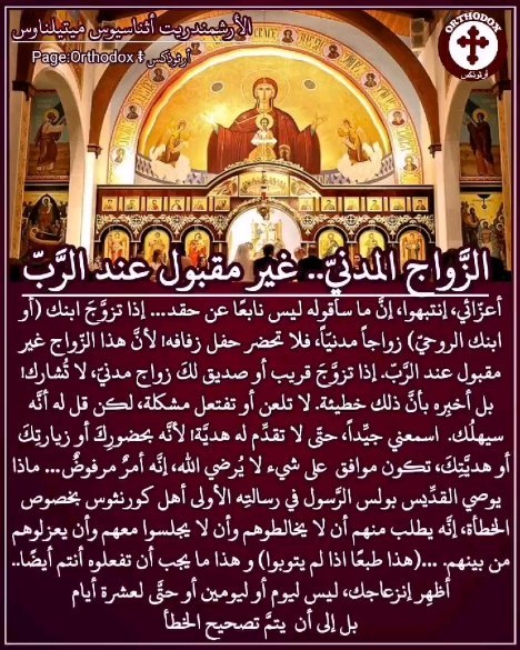أعزّائي، إنتبهوا، إنَّ ما سأقوله ليس نابعًا عن حقد… إذا تزوَّجَ ابنك (أو ابنك الروحيّ) زواجاً مدنيّاً، فلا تحضر حفل زفافه! لأنَّ هذا الزّواج غير مقبول عند الرَّبّ. إذا تزوَّجَ قريب أو صديق لكَ زواج مدنيّ، لا تُشارك! بل أخبِره بأنَّ ذلك خطيئة. لا تلعن أو تفتعل مشكلة، لكن قل له أنَّه سيهلُك. اسمعني جيِّداً، حتّى لا تقدِّم له هديَّة! لأنَّه بحضورِكَ أو زيارتِكَ أو هديَّتِكَ، تكون موافق على شيء لا يُرضي الله، إنَّه أمرٌ مرفوضٌ… ماذا يوصي القدِّيس بولس الرَّسول في رسالتِه الأولى أهل كورنثوس بخصوص الخطأة، إنَّه يطلب منهم أن لا يخالطوهم وأن لا يجلسوا معهم وأن يعزلوهم من بينهم. …(هذا طبعًا اذا لم يتوبوا) و هذا ما يجب أن تفعلوه أنتم أيضًا.. أظهِر إنزعاجك، ليس ليوم أو ليومين أو حتَّى لعشرة أيام، بل إلى أن يتمَّ تصحيح الخطأ.