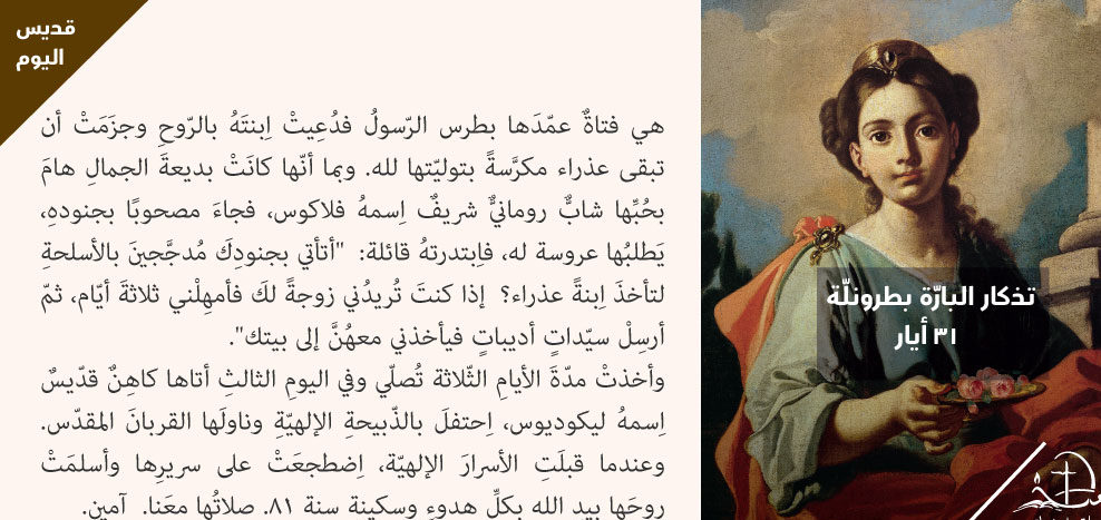 31 أيار تذكار الشهيد هرمياس وفيه أيضًا تذكار البارة بطرونلّة