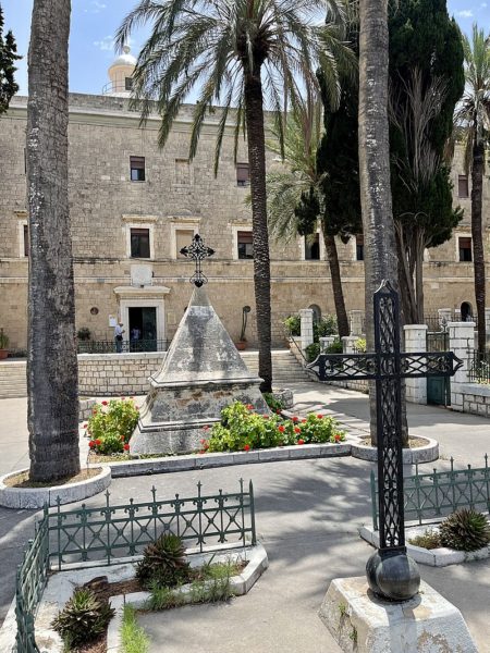 انتقل الكرمليون الى موقعهم الحالي، حيث بنوا كنيسة كبيرة وديراً فوق مغارة معروفة “بمغارة مار الياس”. لإتمام هذا المشروع، كان عليهم ان ينظفوا المكان من أنقاض الكنيسة اليونانية التي بُنيت في العصور الوسطى والمعروفة باسم “دير القديسة مرغريت” ومن أنقاض كنيسة صغيرة وقديمة تعود الى ما قبل الحروب الصليبية. اثناء حملة نابليون (1799)، اُصيبت كنيسة الكرمليين بدمار كبير. وقد أحضر الجنود الفرنسيون الذين أُصيبوا بالوباء الى الدير لمعالجتهم. إلا انه عند انسحاب نابليون، قتل الأتراك الجنود الجرحى وطردوا الرهبان. وعندما سنحت للرهبان اول فرصة للعودة الى الدير، قاموا بدفن جثث الجنود بصورة لائقة في حديقتهم، ورفعوا تذكاراً بشكل هرم فوق القبر. اما الصليب الحديدي الذي على قمة الهرم فنحته ملاحو السفينة “شاتو- رينو “.