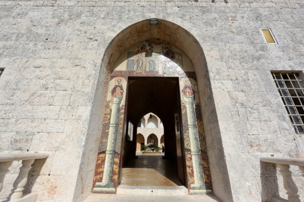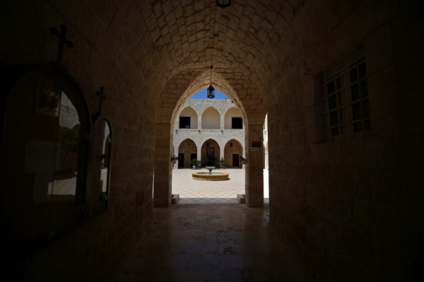 و يوجد رواق معقود يتألف من أقواس محددة الرأس وخلفه أبواب تقود إلى غرف الديروالصوامع، وإلى شرق الباحة كنيسة سيدة البشارة.