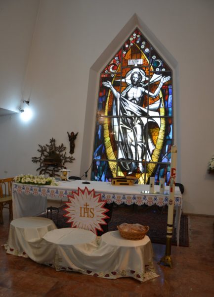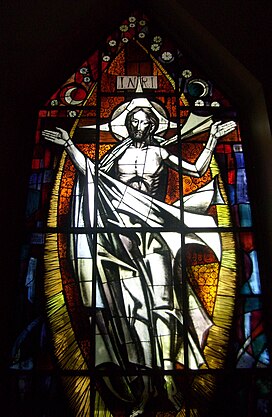 الرسم الزجاجي الرئيسي (روديلي) المنتصر على الموت: وهي أيقونة في غاية الروعة وتحمل معان عميقة جداً، إذ أنها تمثل السيد حسب رؤية بولس الذي لم يلتق به في حياته. فهي تمثل السيد القائم من بين الأموات، الممجد والسرمدي، والخلفية تظهر الصليب المقدس.