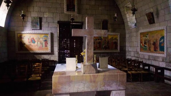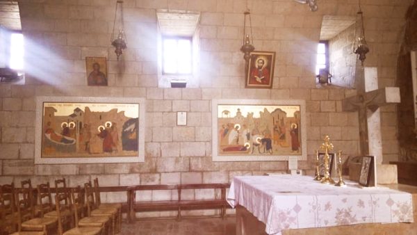 بعد دخول البوابة، والوقوف على العتبة الأولى من المنصة الداخلية لباب كيسان، تُصادفنا حجرة يسارية، مُلئت رفوفها بالصور الدينية والكثير من أنواع الهدايا الصغيرة، والتحف الخشبية المجسدة لقصة السيد المسيح، والديانة المسيحية. وهناك أيضاً نجد باب الحجرة الأثري، البالغ من الارتفاع ما يقارب المتر ونصف المتر، وعمره 25 سنة، صمّمه فنان أرميني، حيث عمل على تزيينه برسوم نافرة ونقوش بالغة الاتقان، مرصعة بالنحاس، تمثل دلالاتها التشكيلية عملية العمادة للسيد المسيح على يد القديس يوحنا المعمدان، وهناك الكثير من النحاتين الذين قدموا إلى زيارة المعبد وحاولوا تقليد الباب بالنحت على الحجر الرخامي، لكنهم فشلوا وتركوا منحوتاتهم غير المكتملة بصمة منهم تدل على انسجامهم ووفائهم للرؤية الحسّية، التي أضافها هذا المعلم الأثري إلى ذاكرتهم الجمالية، ومخزونهم المعرفي.