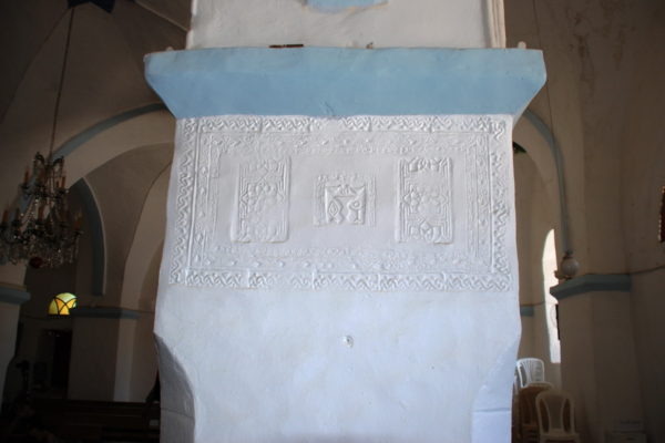 واللافِت للنَظر إن الأعمدة الأربعة الّتي تستند عليها قناطر الكنيسة الداخلية تَحمِل نقوشاً مَضغوطَة وغير محفورة، عليها رموز دينية في جِهاتها الأربع. يعلو مَذبحها الأوسط صورة زيتية لمار نُهرا يُعتقد انها لداود القرم. وعلى المَذبح الأيمن صورة زيتية لمار باسيليوس لداود القرم أيضاً سنة 1892، الذي رسم كذلك صورة المذبح الأيسر الزيتية التي تُمثّل السيّدة العذراء سنة 1878. ونَجِد على المذبح الأوسط كتابةً منقوشة هذا نصُّها: