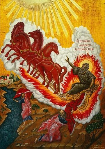 للنبي إيليا أكثر من أيقونة، بعضها يصوّره على أنه جالس يفكّر أمام المغارة، فوقه غراب حامل في فمه طعامًا له. وفي أيقونة أخرى، نرى النبي إيليا جالسًا في مركبةٍ من نار، تجرّها أحصنةٍ نحو السماء، تلفّها غيومًا بيضاء.