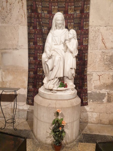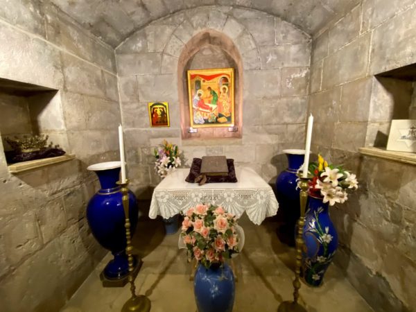 النزول إلى الكهف في كنيسة القديسة حنة في القدس، يشبه الدخول في تاريخ ميلاد السيدة العذراء مريم. ستجد هنا لوحات متعلقة بتلك اللحظة التاريخية . ووفقا للتقاليد القديمة للكنيسة، لم يتمكن يواكيم وحنة ، والدا مريم العذراء، من إنجاب الأطفال . ولكن كان لديهما نعمة من الله . ومن حنة التي قال الجميع أنها عقيمة، وُلدت مريم، أم المخلص وأمنا. يقول إنجيل يعقوب المنحول،إن مريم عاشت هنا مع يواكيم وحنة. وفي هذا المكان، تم الحبل بالطفلة التي وُلدت بدون خطيئة.