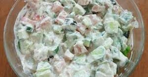 - تقطع الخيار والطماطة والبصل إلى مكعبات.