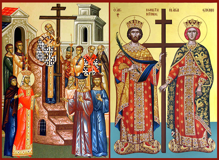 † نعاين الصليب مرفوعاً وعن يمينه ويساره القديسان قسطنطين وهيلانة فهما مَن سعيا لاسترجاع عود الصليب المكرّم.